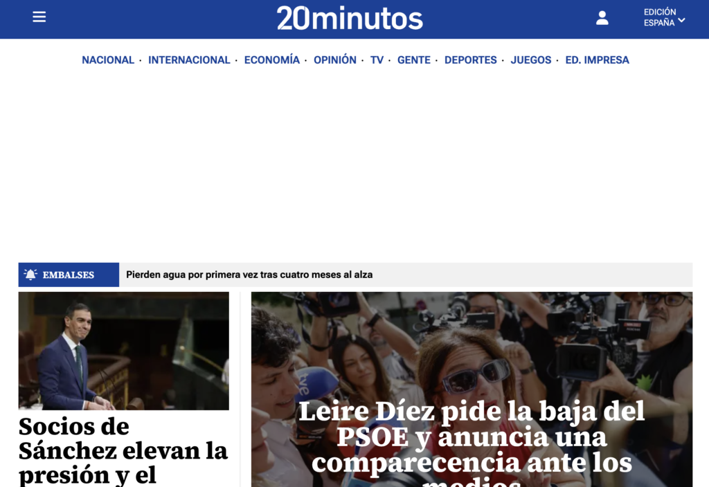 Un portal de noticias con varias secciones principales accesibles desde la home (Política, Deportes, Cultura, Economía), todas al mismo nivel, como por ejemplo 20minutos.