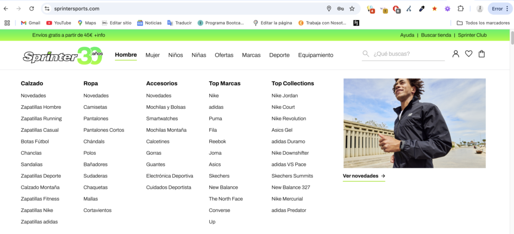 Un ejemplo sería un ecommerce deportivo con la estructura: Home > Deportes > Fútbol > Botas de fútbol, como la que he comentado antes. Como por ejemplo Sprinter.